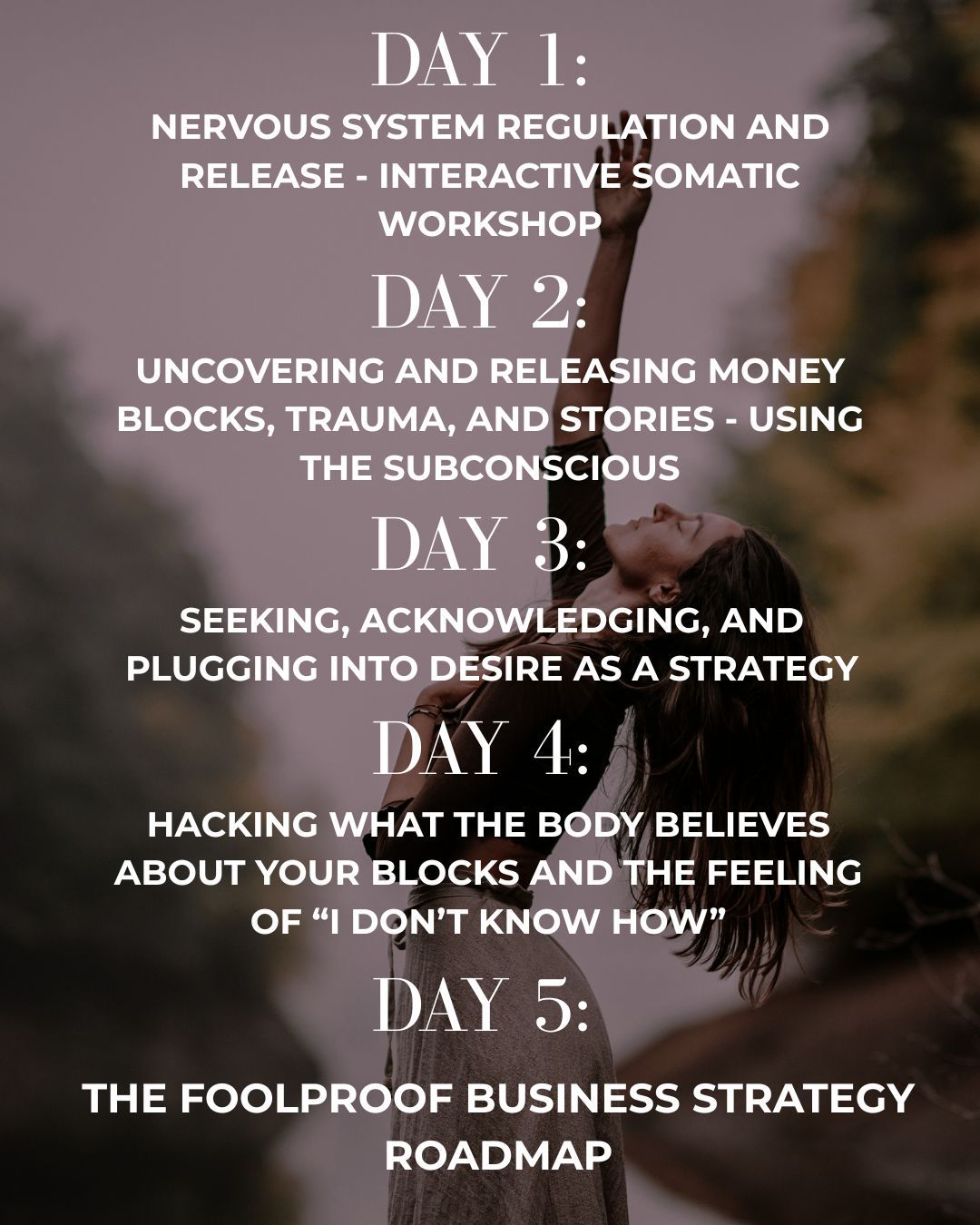 A 5 day live masterclass series for somatic, emotional breakthroughs and brass tax business strategy